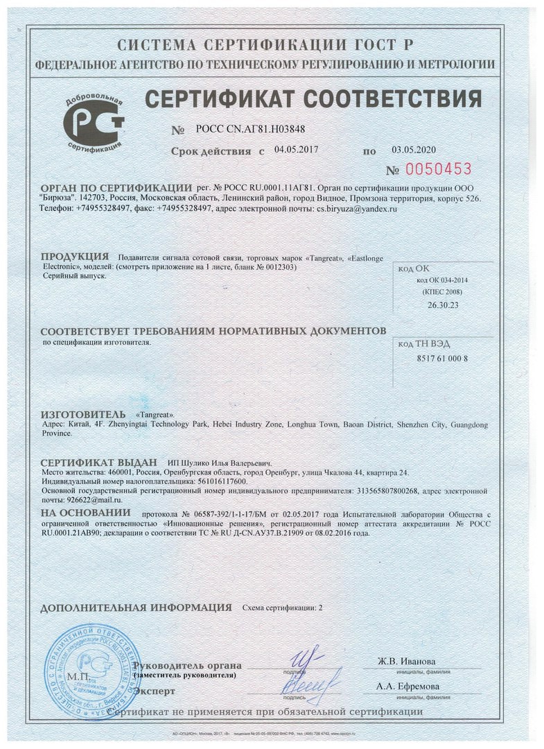 1. Блокирует все известные стандарты мобильной связи: GSM 900-1800, CDMA, 3G и 4G