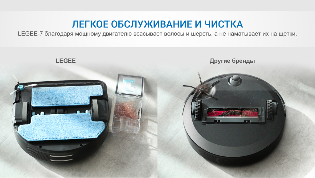 Управление через голосовые помощники Google Assistant и Siri дает возможность управлять LEGEE-7, начинать режим уборки, направлять его на уборку в конкретном помещении, останавливать процесс уборки не прикасаясь к роботу и не беря в руки телефон.
